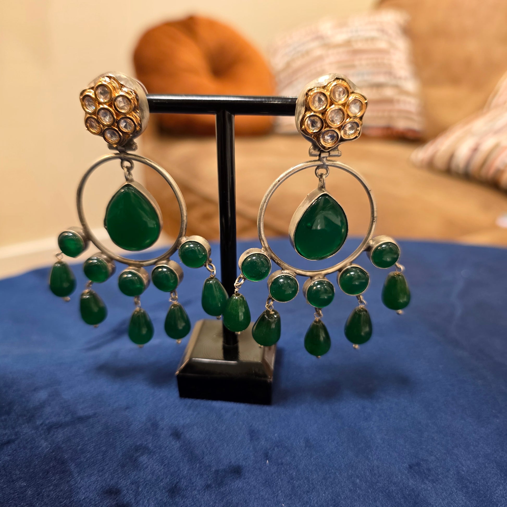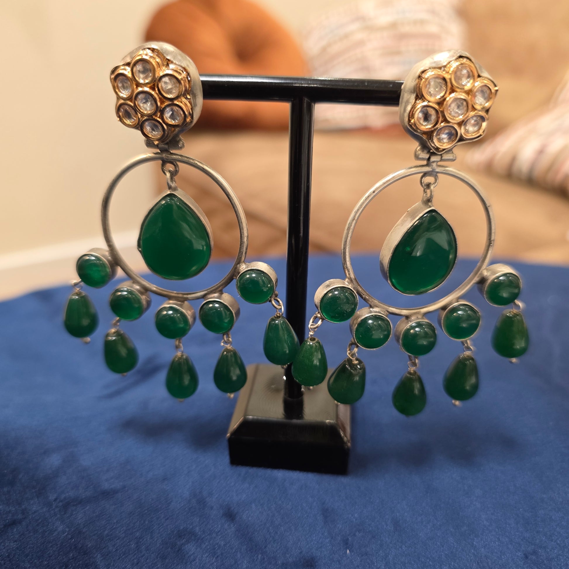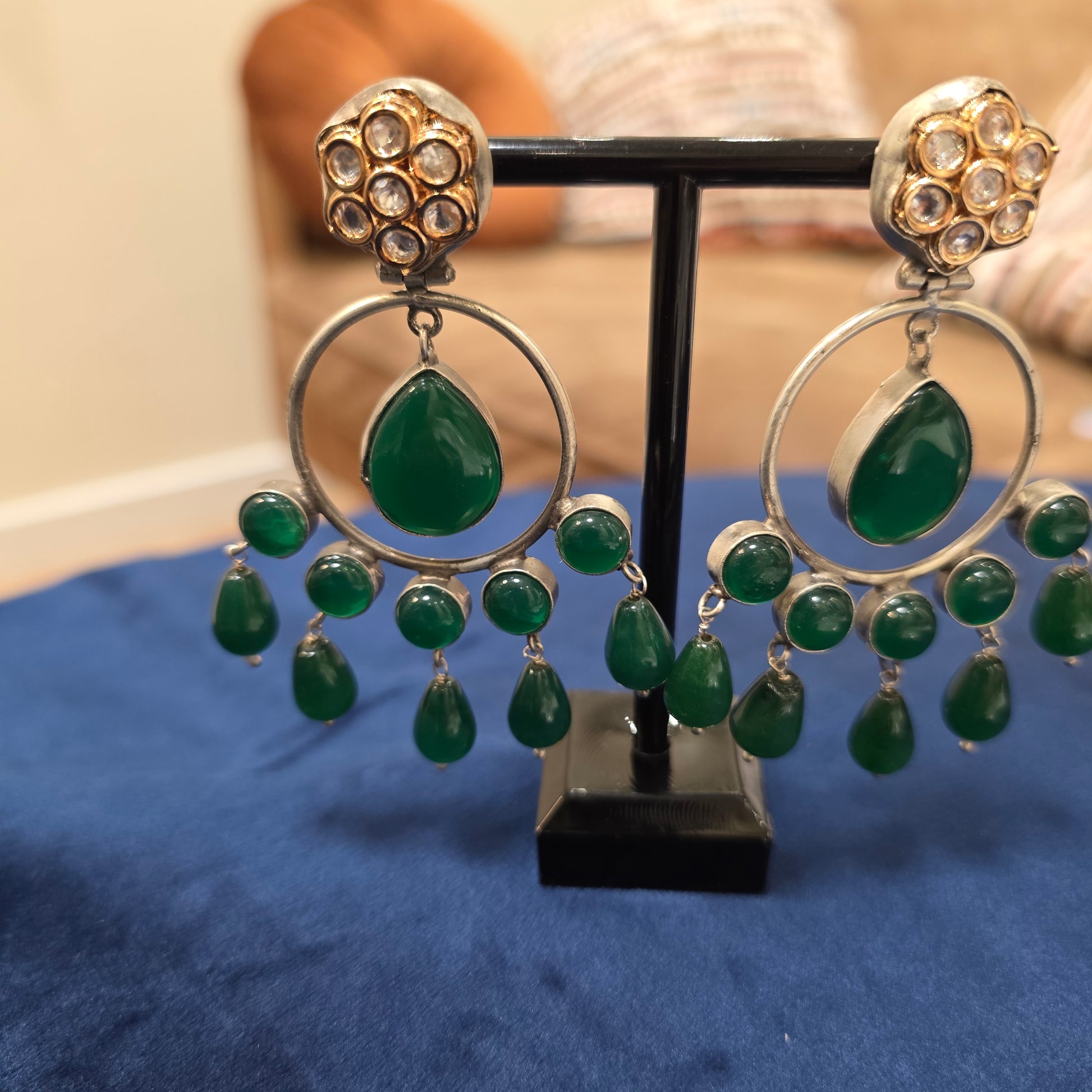 These beautiful silver-replica earrings are hand crafted from brass and feature a chandbali (design inspired by the shape of a crescent moon) design. Adorned with natural stones and finished with a tube stones at the end. A piece that reflects exceptional jewelry craftsmanship from Jaipur, highlighted by the vibrant use of gemstones.
