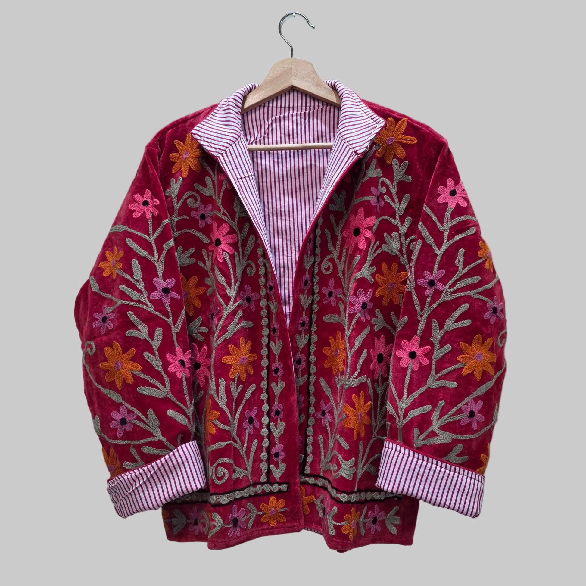 So, a suzani jacket isn’t a specific jacket style like a puffer or bomber—it’s any jacket cut that’s been crafted from or embellished with these traditional embroidered textiles.