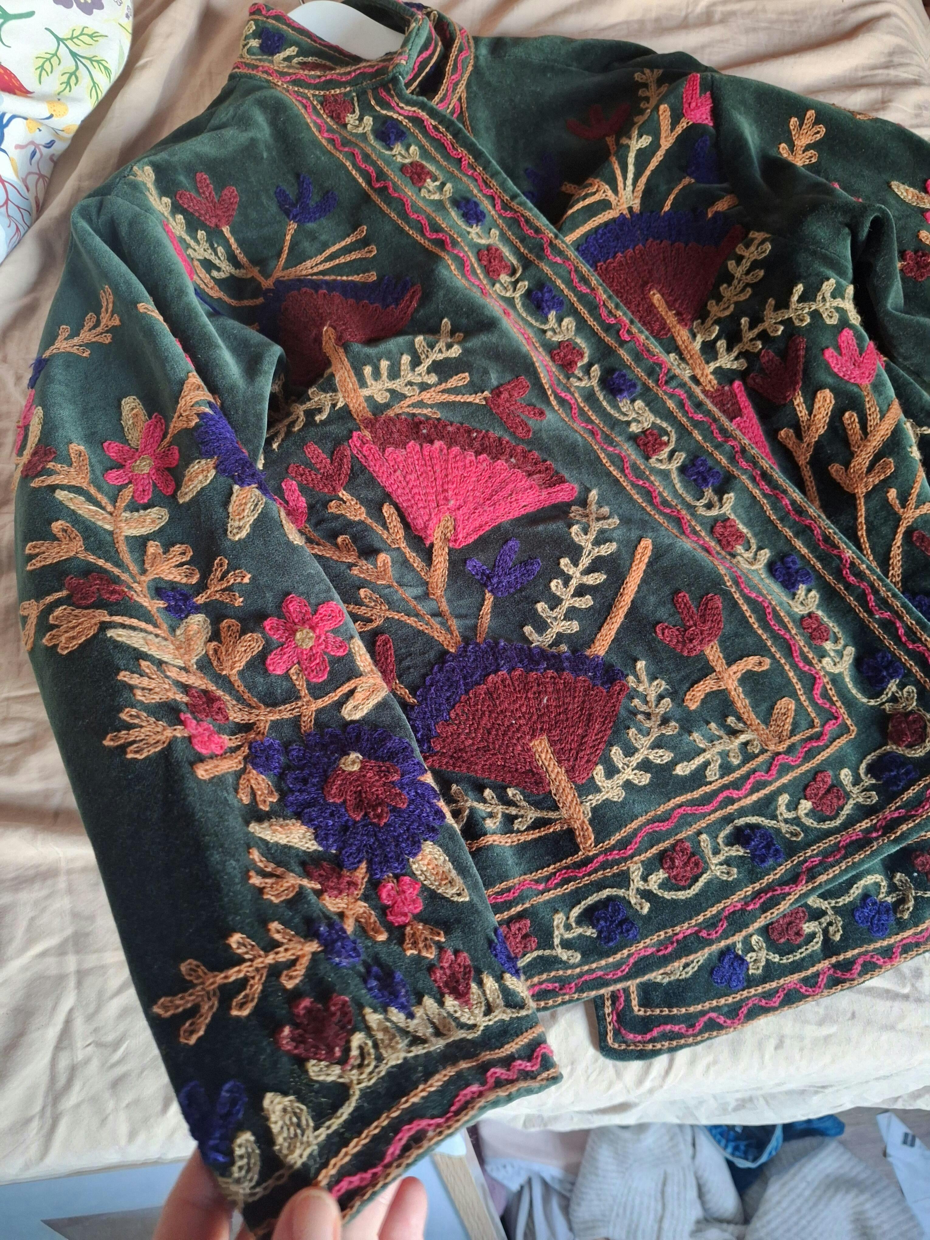 So, a suzani jacket isn’t a specific jacket style like a puffer or bomber—it’s any jacket cut that’s been crafted from or embellished with these traditional embroidered textiles.