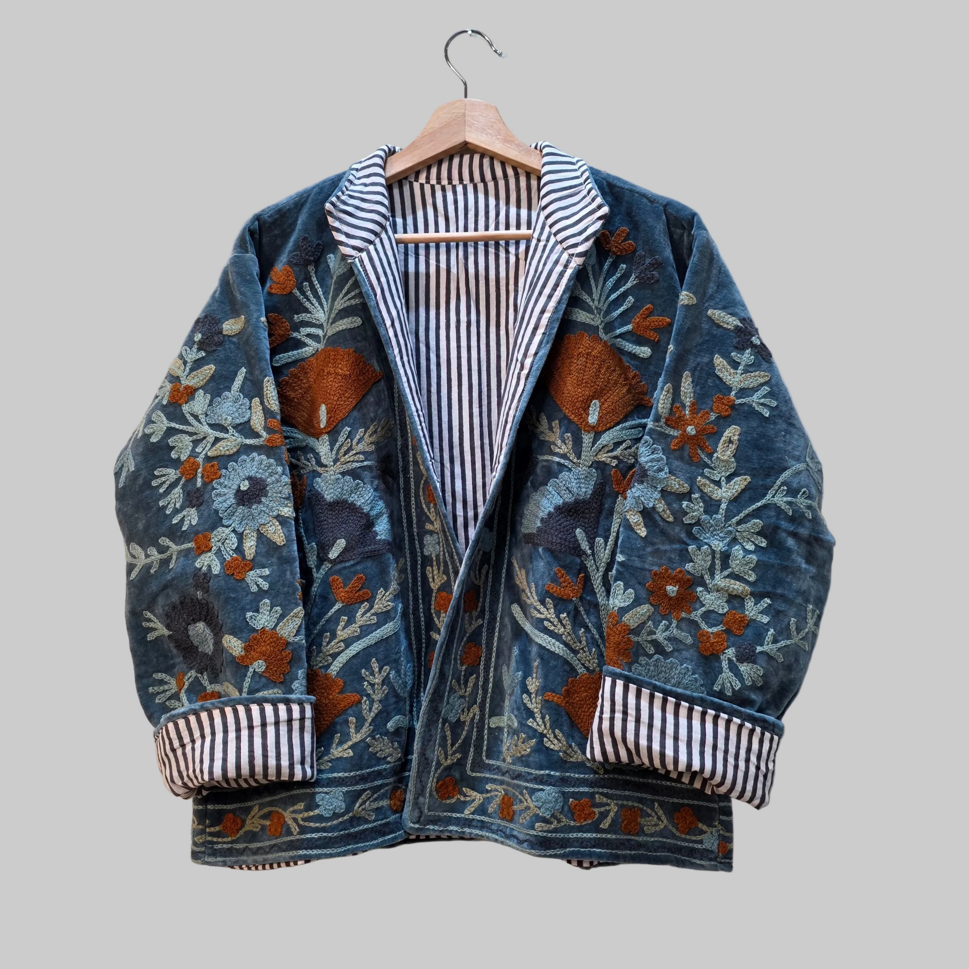 So, a suzani jacket isn’t a specific jacket style like a puffer or bomber—it’s any jacket cut that’s been crafted from or embellished with these traditional embroidered textiles.