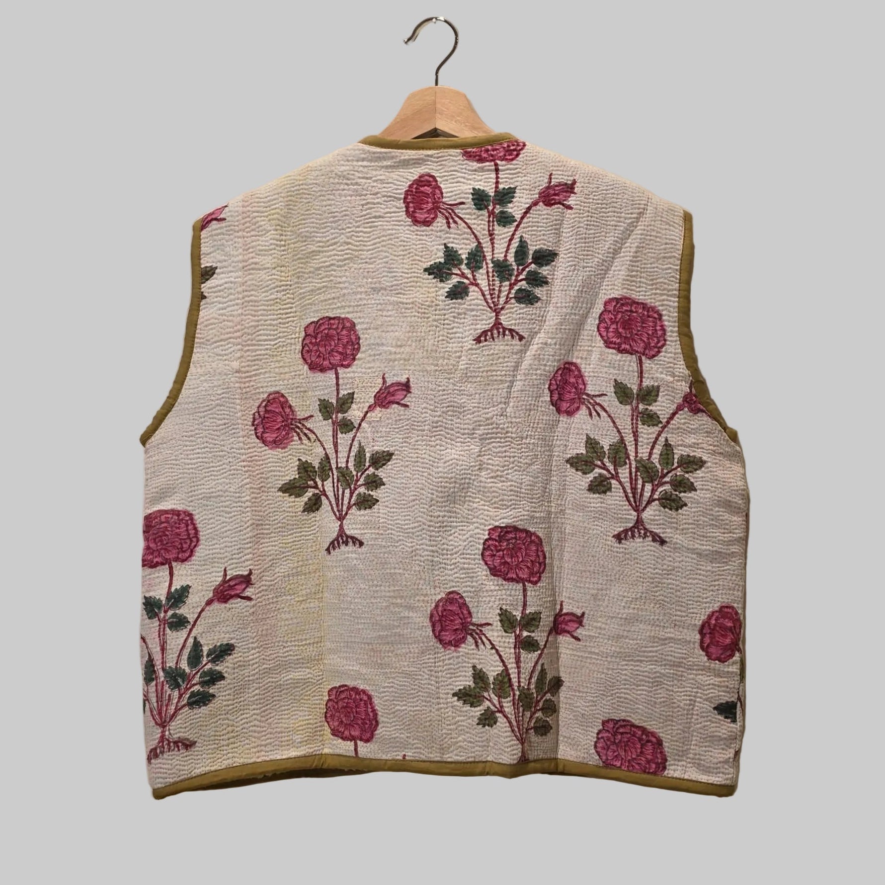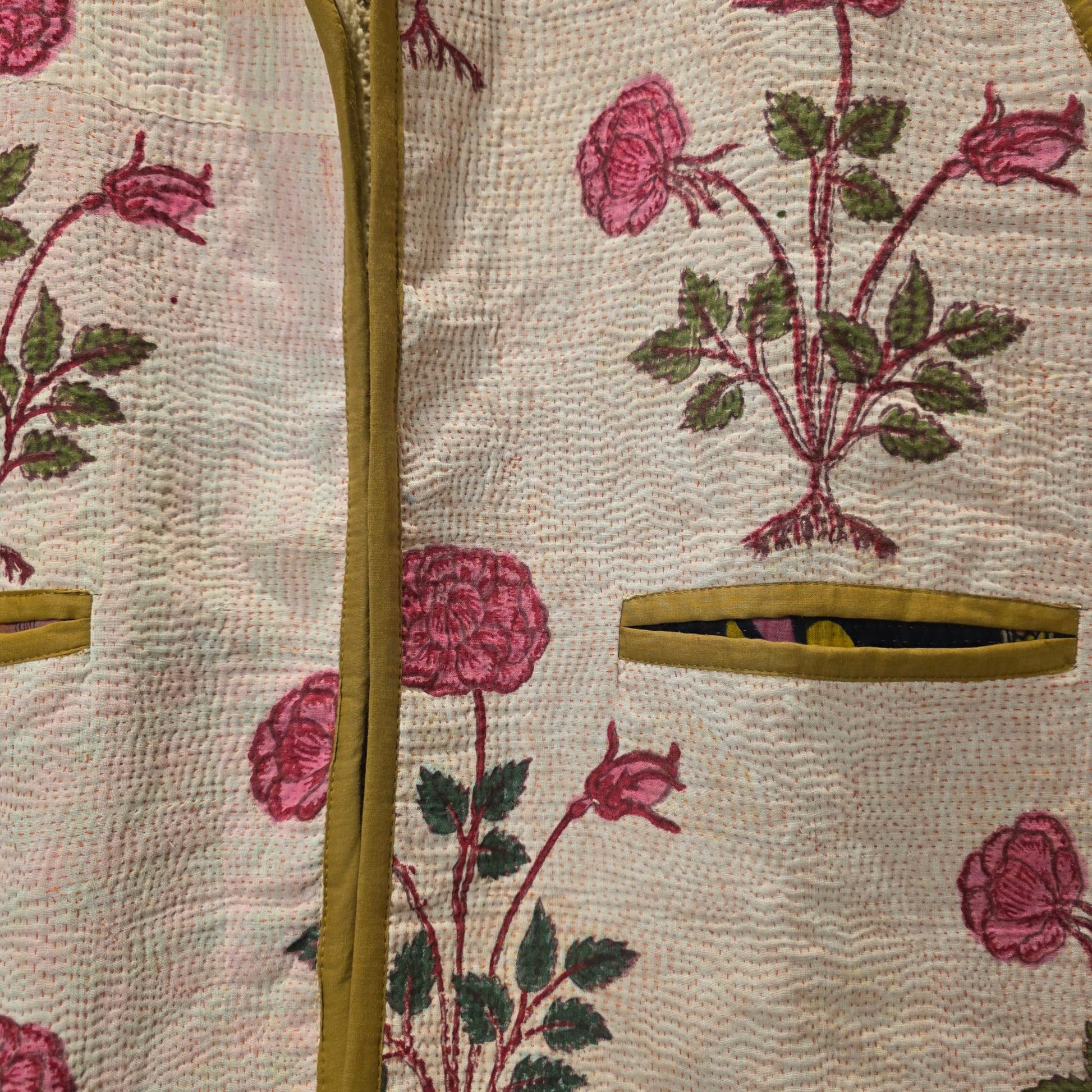 Kantha jacket refers to a type of jacket traditionally made using Kantha or Kantha stitching — a style of hand-embroidered running stitch from eastern India (mainly West Bengal and Bangladesh). This jacket is featured with beautiful handblock printing with kantha.