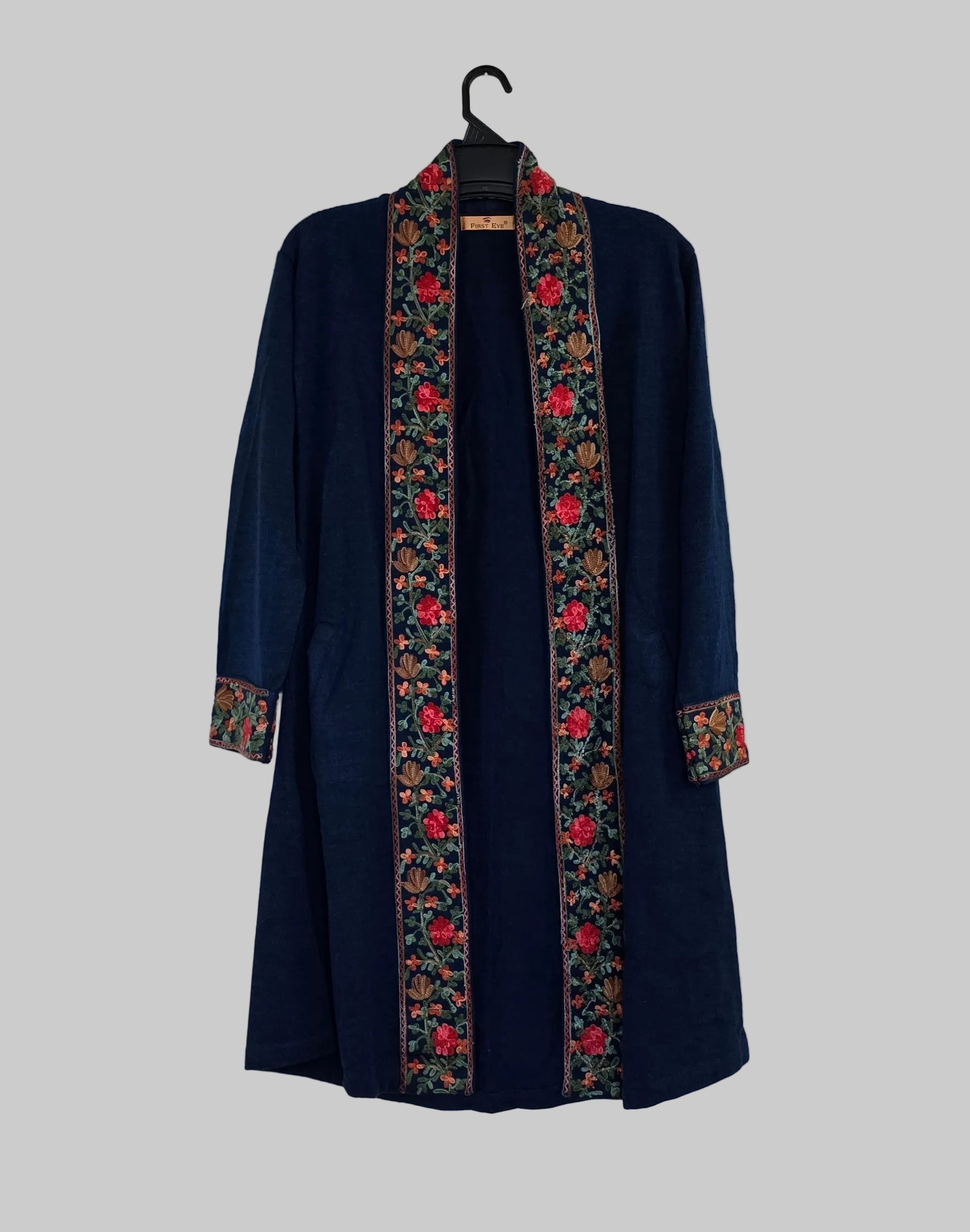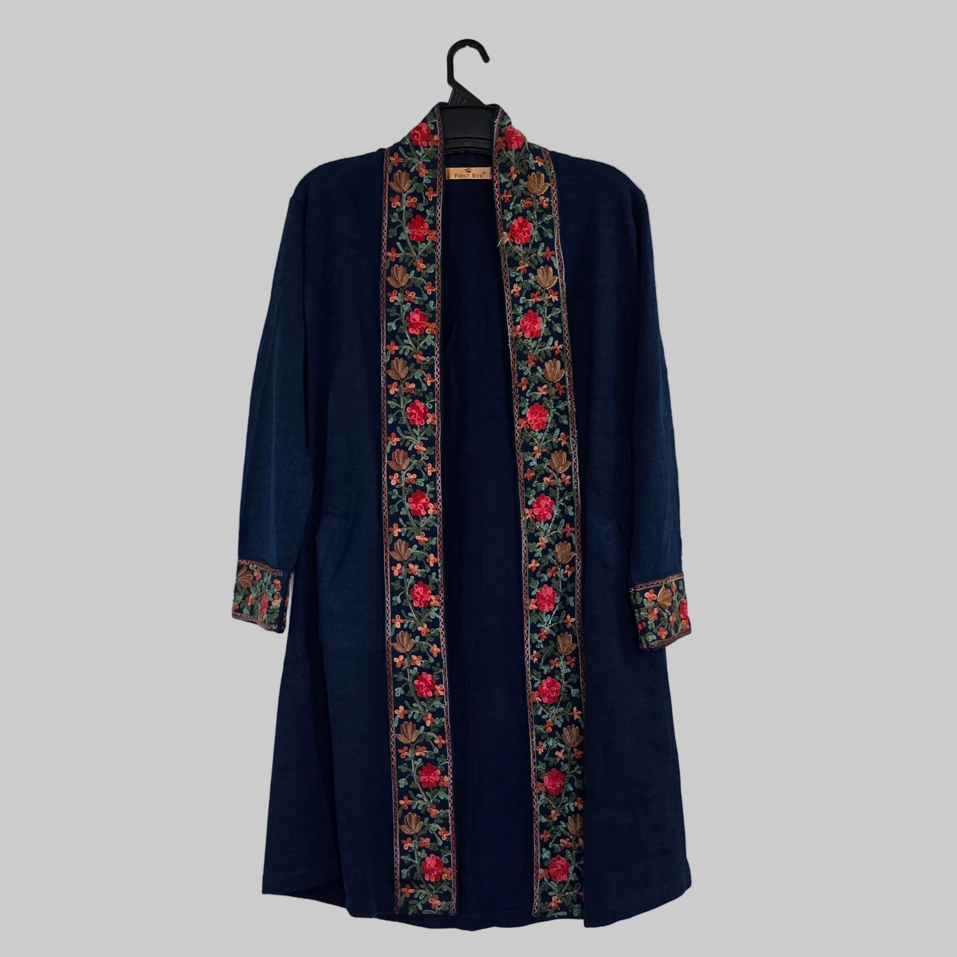 Woolen shrug with Kashmiri style embroided border. It is Stratchable with frontpockets. Embroidery at one side is not perfect