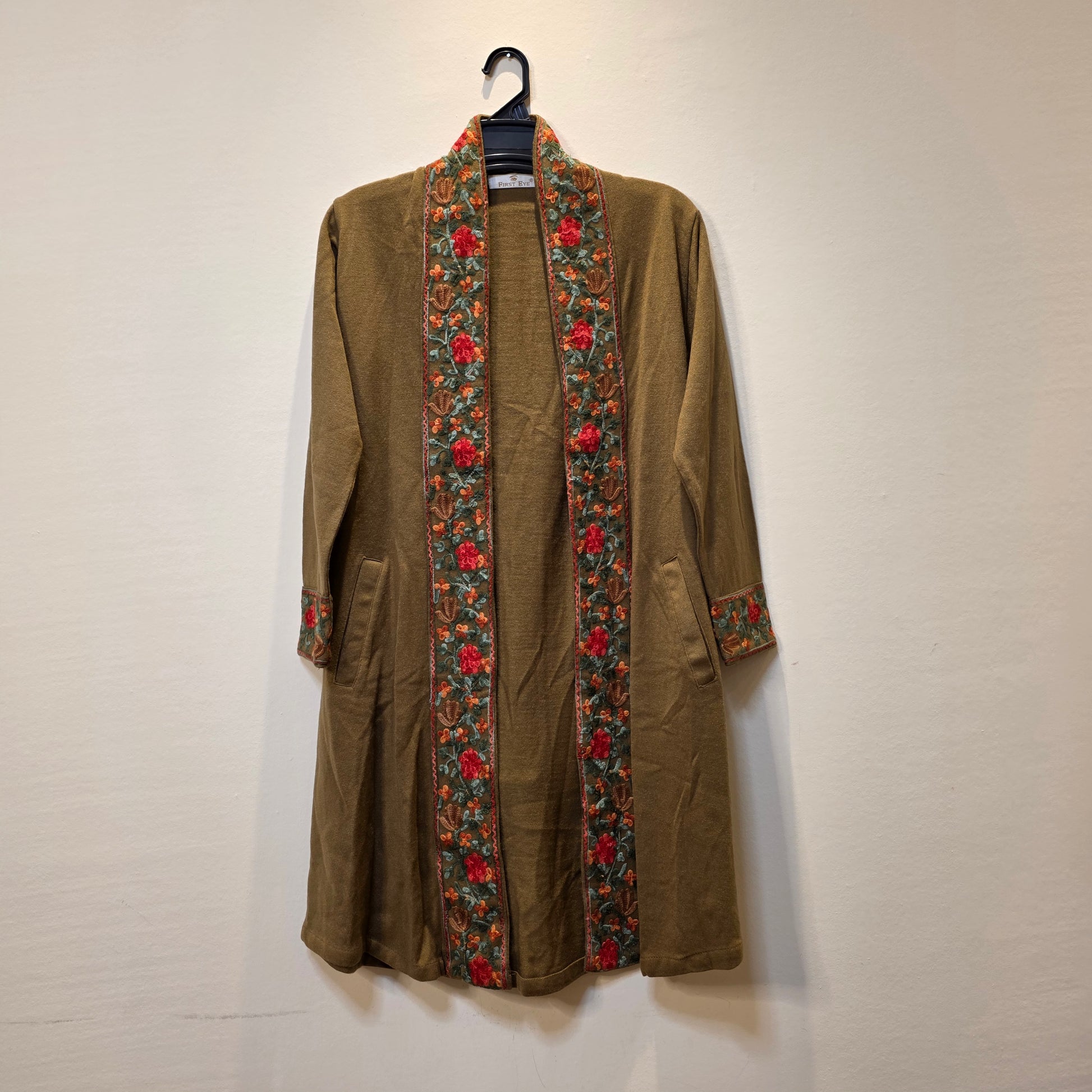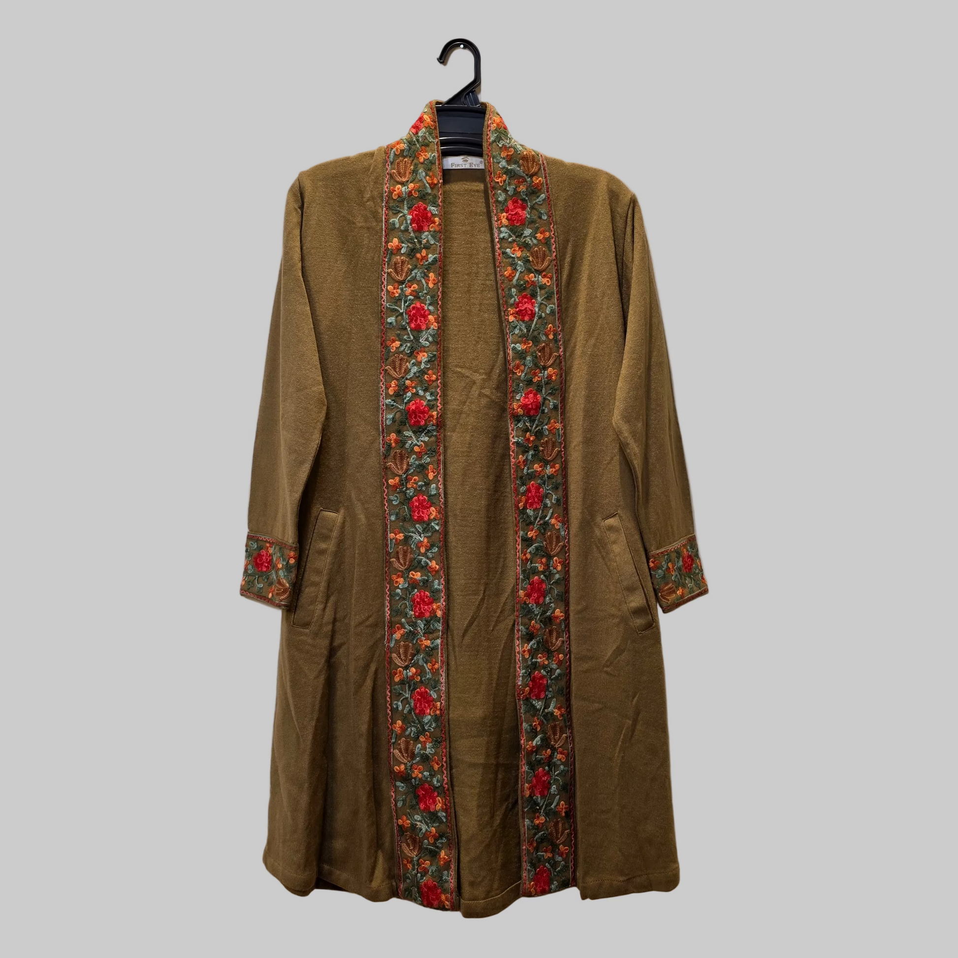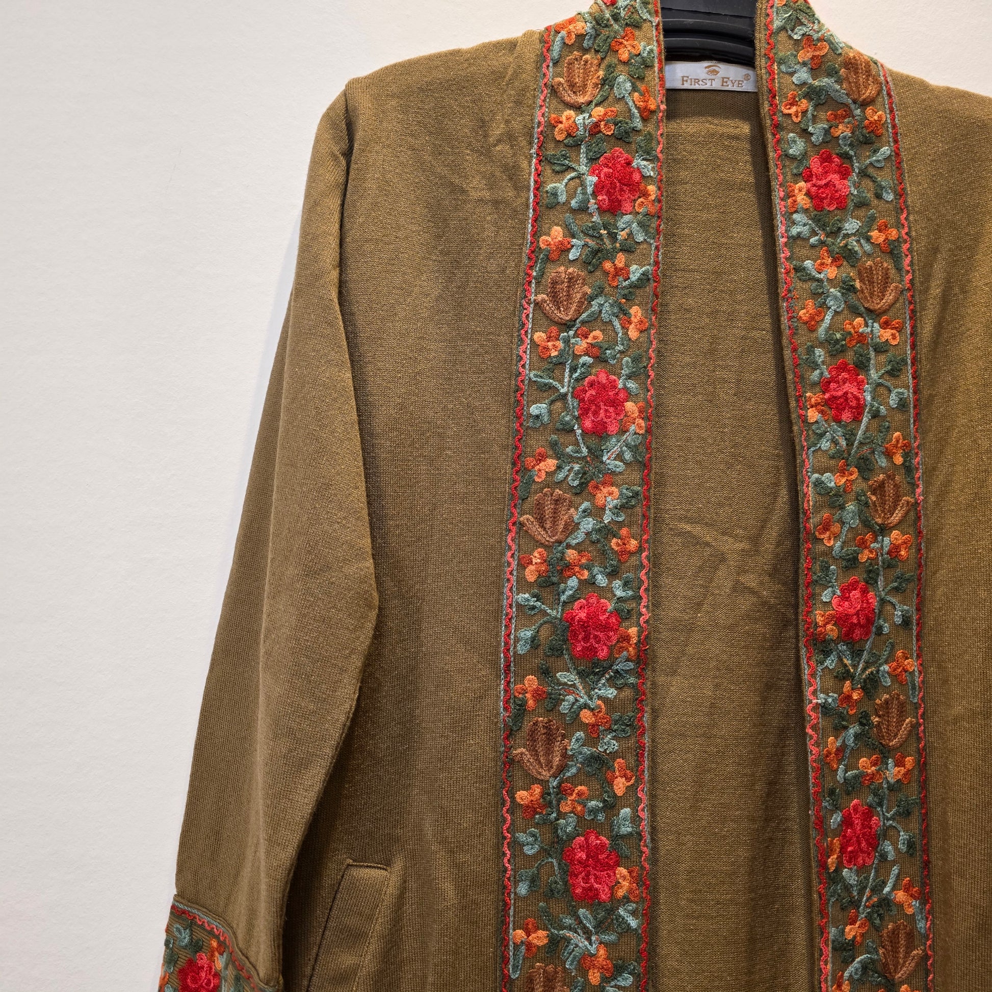 Woolen shrug with Kashmiri style embroided border. It is Stratchable with frontpockets.