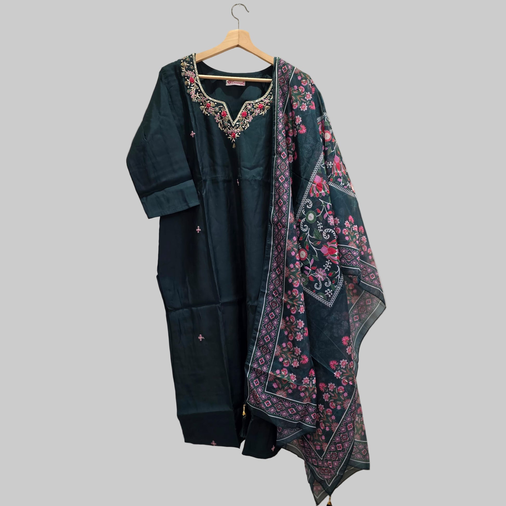 Very comfortable, breathable and flowy Dola silk suit ( blended silk fabric, typically made from a mix of silk and polyester or viscose) consists