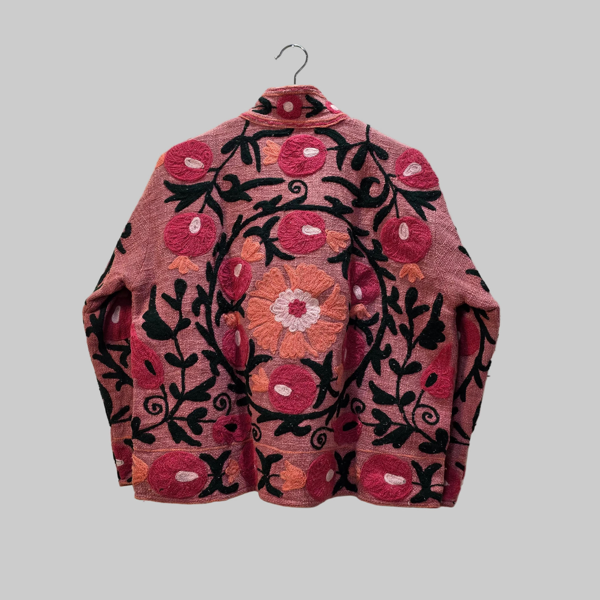 So, a suzani jacket isn’t a specific jacket style like a puffer or bomber—it’s any jacket cut that’s been crafted from or embellished with these traditional embroidered textiles.