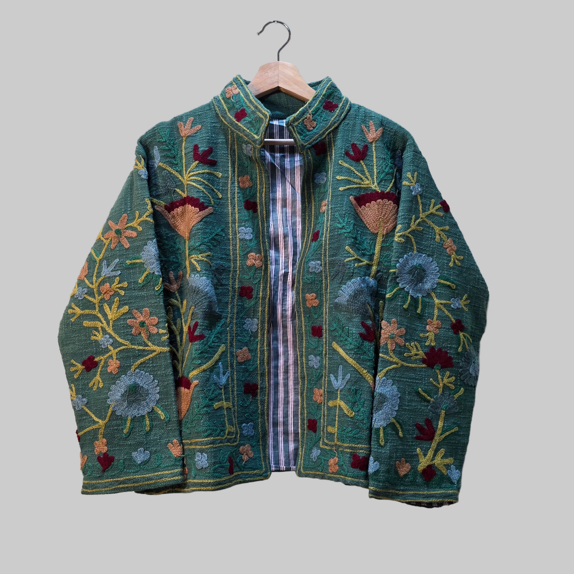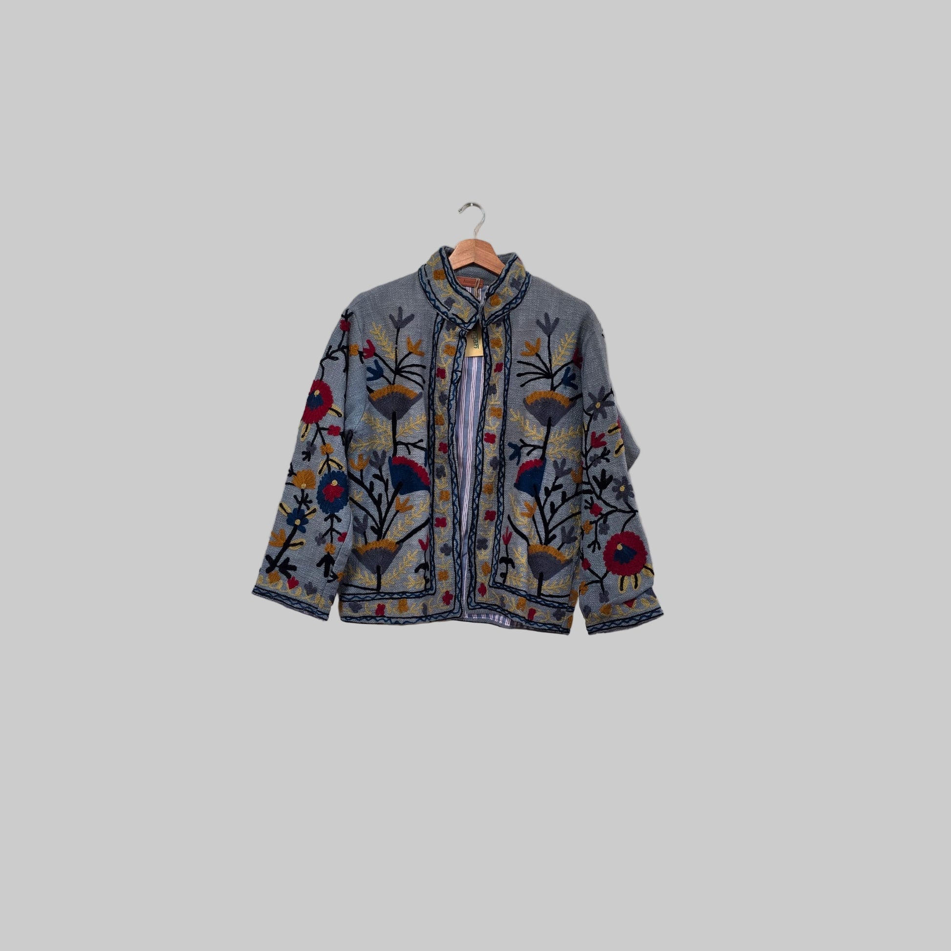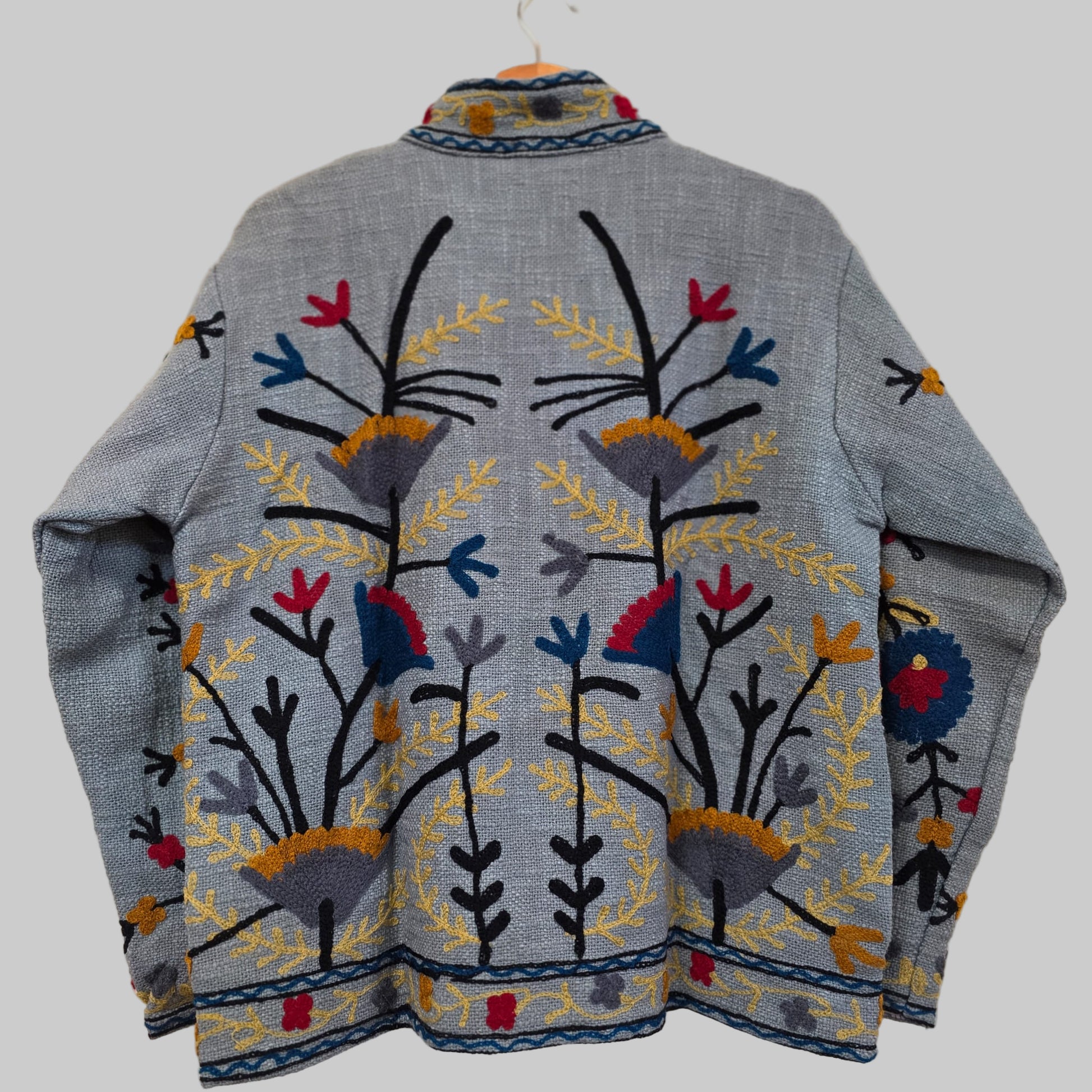 So, a suzani jacket isn’t a specific jacket style like a puffer or bomber—it’s any jacket cut that’s been crafted from or embellished with these traditional embroidered textiles.