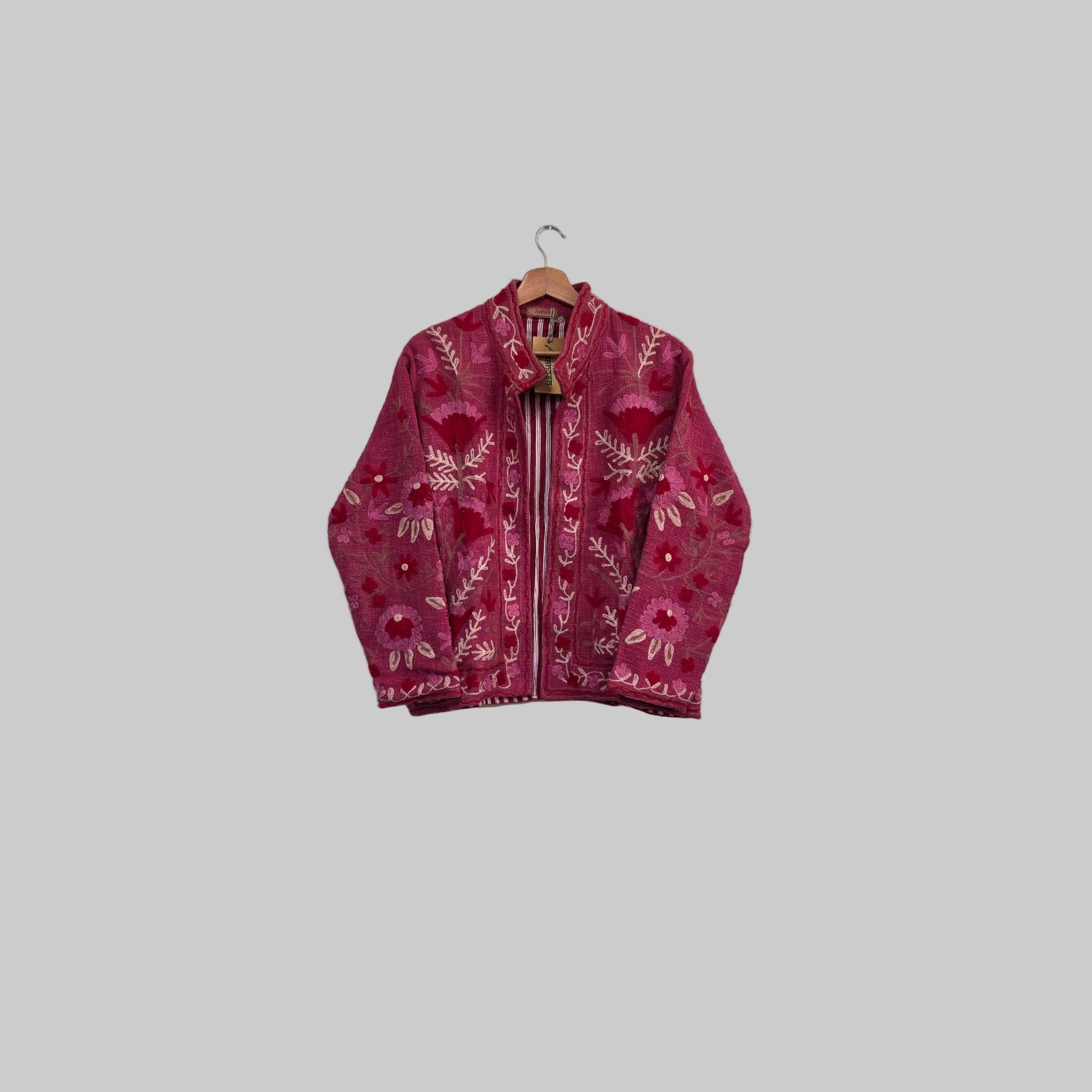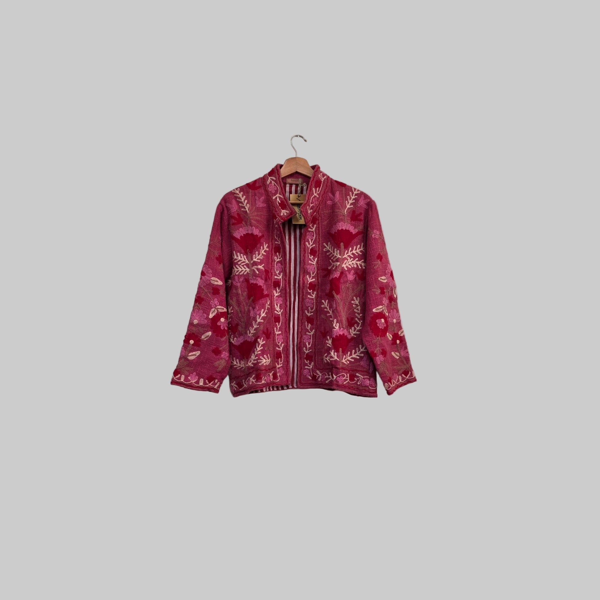 So, a suzani jacket isn’t a specific jacket style like a puffer or bomber—it’s any jacket cut that’s been crafted from or embellished with these traditional embroidered textiles.