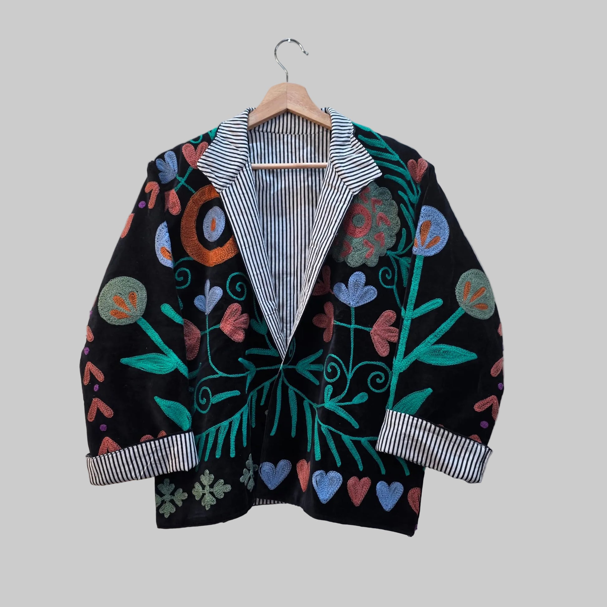 So, a suzani jacket isn’t a specific jacket style like a puffer or bomber—it’s any jacket cut that’s been crafted from or embellished with these traditional embroidered textiles.