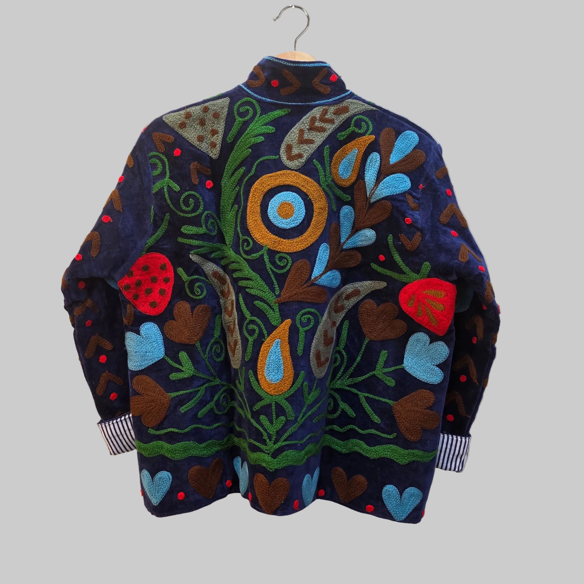 So, a suzani jacket isn’t a specific jacket style like a puffer or bomber—it’s any jacket cut that’s been crafted from or embellished with these traditional embroidered textiles.