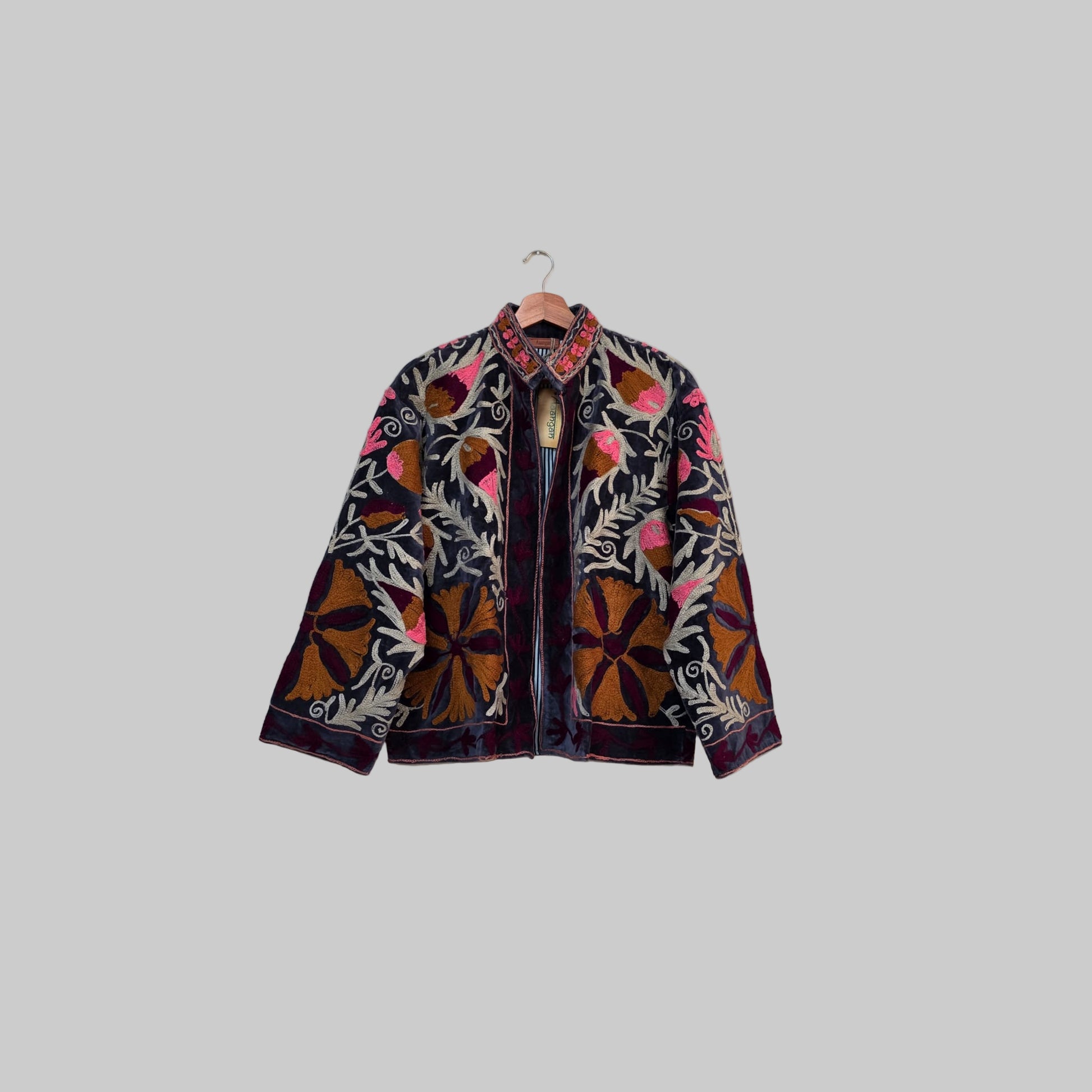 So, a suzani jacket isn’t a specific jacket style like a puffer or bomber—it’s any jacket cut that’s been crafted from or embellished with these traditional embroidered textiles.